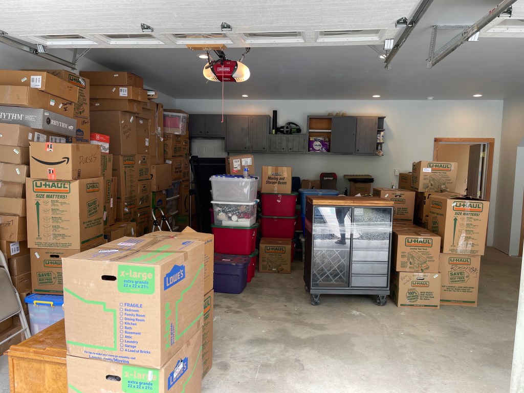 Since we have no ETA on when our crap will ever leave Boise(at least several weeks if it hasn’t all melted sitting in that trailer in the sun), we get to run around and buy crap we already have in order to live bare bones in the house,
